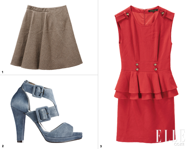 1 톤 다운된 브라운 풀 스커트. 42만9천원. 미샤. 2 세련된 버클 디테일의 블루 스웨이드 샌들. 굽 11cm. 22만8천원. EnC. 3 보디라인을 돋보이게 해주는 레드 원피스. 23만8천원. 에고이스트. |