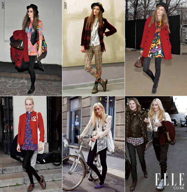 믹스매치의 대가, 이켈린 스탠지(Iekeliene Stange) 날카로운 턱선과 튀어나온 광대뼈, 깡마른 체구의 모델 이켈린 스탠지는 자신만의 패션 세계가 분명한 믹스매치의 대가다. 데뷔 초창기 이켈린은 큼지막한 안경과 프린트가 가미된 컬러풀한 티셔츠들을 레이어링해 입는 등 자칫 촌스러워질 수 있는 것들을 본인만의 개성으로 소화해냈다. 2008년 패션 위크에서는 화려한 색의 체크 팬츠와 플라워 프린트 워커 등 다채로운 프린트들을 총동원해 자신만이 할 수 있는 믹스매치의 끝을 보여주기도. 한동안 런웨이에서 볼 수 없던 그녀는 지난 시즌 다시 활동을 재기하면서 밝은 블론드 헤어에서 내추럴한 다크 브라운 컬러로 머리색을 바꾸고, 지난 파리 오트 쿠튀르 쇼 백스테이지에서는 자수 디테일의 블라우스와 쇼츠로 한층 여성스러워진 모습으로 완벽하게 스타일 턴오버를 이뤘다. |