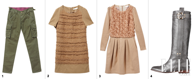 1 포켓 디테일의 밀리터리 팬츠. 11만8천원. 리바이스. 2 트위드 소재의 여성스러운 원피스. 36만5천원. SJ SJ. 3 페미닌한 러플 디테일과 주얼리가 포인트인 원피스. 41만5천원. SJ SJ. 4 버클 디테일의 라이딩 부츠. 굽 2.5cm. 20만원대. 엘리자벳. |