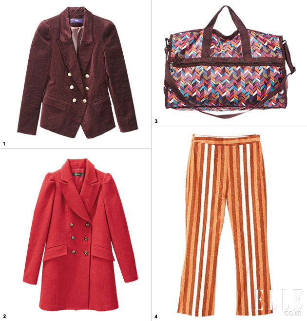 1 골드 버클로 포인트를 준 벨벳 소재 레드 재킷. 15만8천원. 리스트. 2 이켈린이 가장 사랑하는 아이템인 강렬한 레드 재킷. 20만원대. CC 콜렉트. 3 가볍고 큼지막한 사이즈로 활동도 만점인 화려한 패턴 빅 백. 19만8천원. 레스포색. 4 오렌지 스트라이프 팬츠. 가격 미정. H&M.