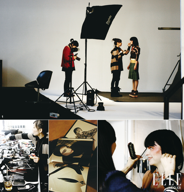 1 화보 촬영장에서 작업에 열중하고 있는 요카우. 2 메이크업 룸에서 화장품을 정리하는 중. 3 그간의 작업을 정리해둔 포트폴리오. |