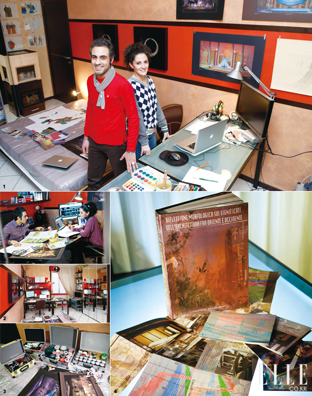 1 두 사람은 비전과 열정을 공유한는 멋진 파트너. 2 작업실 전경. 3 스케치 작업을 위한 도구들. 4 졸업 프로젝트와 논문. |