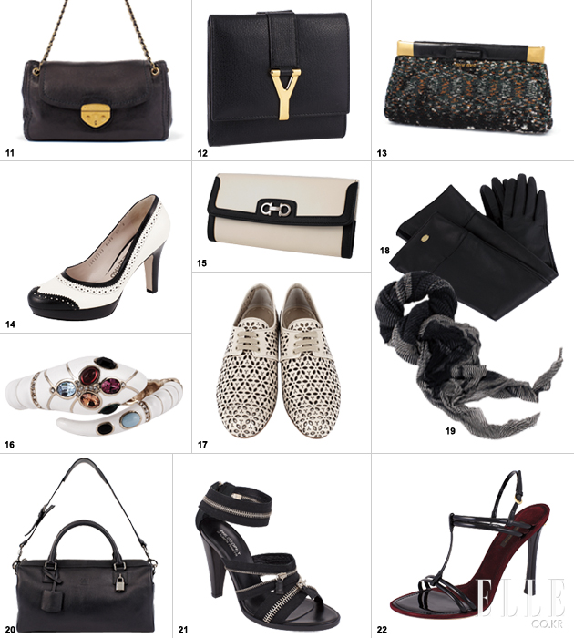 11 소가죽 소재, 메탈 체인 스트랩 디테일. 28X25X9cm. 2백1만원, PRADA. 12 염소 가죽 소재, 메탈 록 장식, 12X11X11.5cm. 81만5천원, YSL. 13 송아지 가죽 소재. 스팽글 디테일, 28X13X7cm. 89만원, MIU MIU. 14 소가죽 소재, 펀칭 디테일, 굽 9cm. 75만원대, SALVATORE FERRAGAMO. 15 소가죽 소재, 메탈 하우스 로고, 19X9.5X1.5cm. 36만2천6백원, SALVATORE FERRAGAMO. 16 메탈 소재, 컬러 스톤 세팅. 가격미정, BLUMARINE. 17 송아지 가죽 소대, 펀칭 디테일, 굽 2cm. 78만원, PRADA. 18 양가죽 소재, 메탈 로고 장식. 26만8천원, JILL STUART. 19 캐시미어 소재, 스트라이프 패턴. 77만5천원, MONNI23 BY ELIDEN. 20 염소 가죽 소재, 스트랩 디테일, 35X18X15cm. 1백61만원, LOEWE. 21 코튼 소재, 지퍼 장식, 굽 10.5cm. 55만원, PHILOSOPHY DIALBERTA FERRETTI 22 소가죽 소재. 벨티드 디테일, 굽 14cm. 가격미정, LOUISVYITTON.