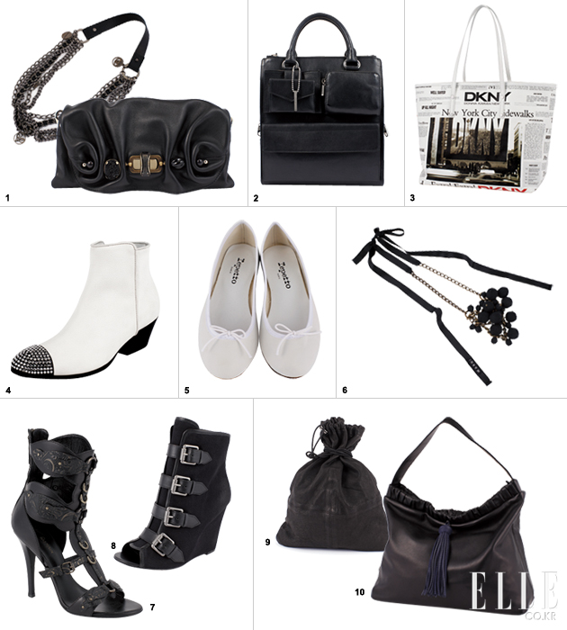 1 송아지 가죽 메탈 소재. 29만원, PHILOSOPIN DIALBERTA FERRETTI. 소가죽 소재, 플리츠 디테일. 31X17X3cm. 1백77만원, NINA RICCI. 2 소가죽 소재, 포켓 디테일. 28X30X11cm. 가격미정, DKNY. 3 PVC 소재. 뉴스페이퍼 프린팅, 34X30X18cm. 가격미정, DKNY. 4 염소 가죽 소재, 크리스털 세팅, 굽 5cm. 1백63만원, GIUSEPPE ZANOTTI BY HEEL N TOTE. 5 송아지 가죽 소재, 보 디테일, 굽 0.5cm. 33만8천원, REPETTO BY HEEL N TOTE. 6 메탈 소재, 볼 장식. 85만원, MARNI. 7 송아지 가죽 소재, 밸티드 디테일. 굽 13cm. 2백35만원, BALMAIN. 8 코튼 소가죽 소재, 벨티드 디테일, 굽 10Ccm. 39만7천원, ASH BY HEEL N TOTE. 9 버팔로 소재, 스트링 디테일, 28X36X1.5cm. 78만원, NEIL BARRETT. 10 양가죽 소재, 태슬 장식, 41X35X13cm.55만원, JILL STUART. |