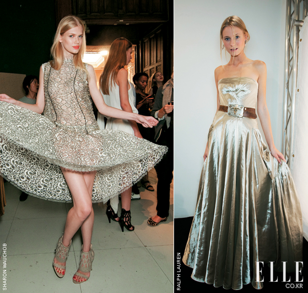 우아하거나! 섹시하거나? 골드 & 실버 셀러브리티들의 시상식 드레스로 여겨졌던 골드와 실버가 이번 시즌에는 한층 다운된 컬러톤으로 리얼웨이에서도 선보일 전망이다. 랄프로렌은 기존의 화이트 블라우스, 프린지 장식, 스웨이드 팬츠와 메탈릭한 컬러의 드레스와 스커트, 마이크로 미니팬츠를 믹스 매치해 미서부 개척시대의 새로운 카우걸들의 모습을 보여줬다. 또한, 이브생로랑와 구찌는 골드 T스트랩 샌들를, 샤넬은 골드 컬러의 미니 클러치와 뱅글을 선보이며 악세서리로 룩에 임팩트를 더해줬다. |