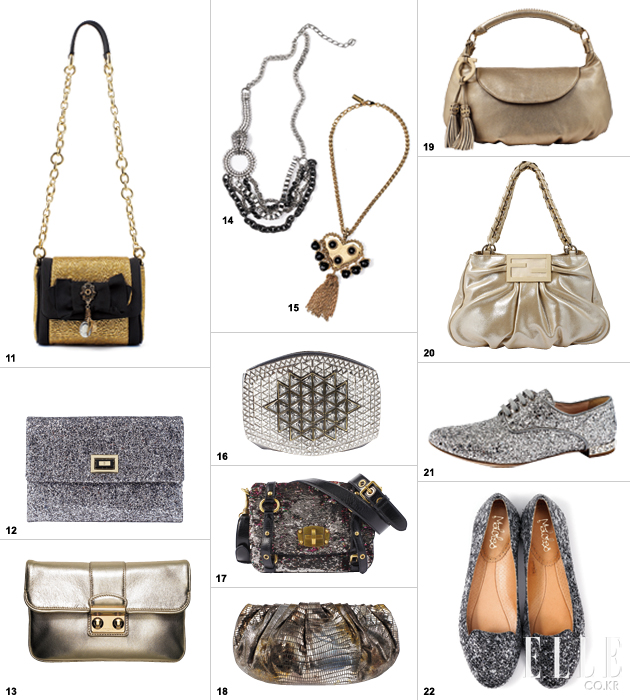 11 코튼 폴리에스테르 소재. 리본 디테일, 14X12X5cm. 1백27만원, DOLCE & GABBANA. 12 코튼 소재. 플랩 디테일. 23X14X1cm. 50만6천원, ANYA HINDMARCH BY HEEL N TOTE. 13 양가죽 소재, 20X13X1cm. 2백2만5천원, LOUIS VUITTON. 14 메탈소재. 체인 디테일. 19만1천원, ERICKSON BEAMON BY ERIDEN. 15 메탈 플라스틱 소재. 메탈 태슬 디테일. 74만원, MOSCHINO. 16 메탈 소재, 크리스털 디테일. 15X11X5cm. 5백3만원, JIMMY CHOO. 17 송아지 가죽 소재. 스팽글 디테일. 22X16X9cm. 1백38만원, MIU MIU. 18 양가죽 소재, 파이톤 텍스처, 26X13X6cm. 69만8천원, DVF BY HEEL N TOTE. 19 양가죽 소재, 태슬 디테일, 40X20X15cm. 1백29만8천원, SALVATORE FERRAGAMO. 20 메탈 소재.더블 F 로고. 31X23X15cm. 94만8천원, FENDI. 21 코튼 폴리에스테르 소재. 크리스털 디테일. 굽 1.5CM. 60만원, MIU MIU. 22 파이톤 소재, 굽 1cm. 65만원, MALOLES BY HEEL N TOT. |