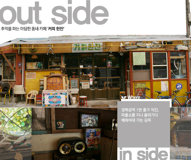 Inside: 갑자기 이 동네, 살고 싶어졌다. 저렴한 다방 커피라도 나올 것 같은 인상을 주지만, 이래뵈도 숯불로 볶은 핸드드립 커피를 취급한다. 문을 여는 순간 알싸하게 퍼지는 원두의 고소한 냄새에 슬그머니 미소가 지어진다. 풍수지리상 명당이라도 되는 걸까. 유리 사이로 스며드는 따스한 햇살의 느낌은 뭐라 형용할 수 없을 정도로 좋다. 이렇게 작고 아담한 동네에서 고급스러운 커피를 즐길 수 있다니! 여기 ‘추억 더듬기’라는 보너스도 있다. 옛날 교실에서 봄직한 책걸상과 한쪽 벽면을 가득 메운 추억의 LP판, 구슬치기 하던 구슬과 바가지로 만든 조명, 각종 골동품 등의 소품들은 고맙게도 어린 시절 추억까지 찾아준다. 한가한 주말 오후 편안한 복장으로 산보를 하다가 잠깐 들러 맛있는 커피 한 잔 하고 싶은 곳.