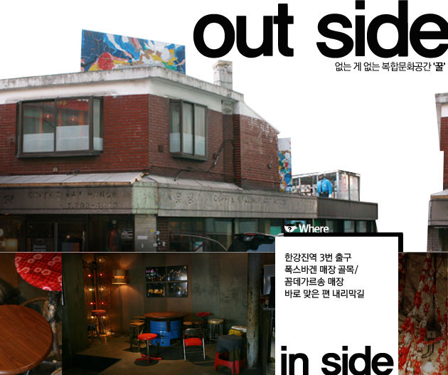 Outside: 뭐야, 진짜 이 건물이 ‘꿀’이란 말이야? 안내판도, 간판도 없다. 정체를 알 수 없는 허름하고도 낡은 이 건물은 예전에 중국집, 쌀집, 꽃집, 사진 현상소를 운영했단다. 그 수많은 사연들을 인위적으로 지우고 싶지 않았던걸까. 각 특색이 있었던 과거들을 그대로 껴안은채 외관을 원형 그대로 보존했다. 진짜 생활의 모습이 그대로 담겨져 있길 원했다는 주인장의 의도는 좋지만, 외관은 영락없는 재개발 직전의 모습이라 찾기도 알아보기도 쉽지 않다. 그렇기에 '꿀'을 찾으려면 매의 눈을 하고 주위를 유심히 살펴봐야 한다. 아니면 '뭐야, 이건?'하고 그냥 지나가버리고 말테니까.