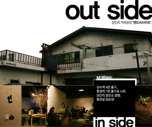 Outside: 저기 한 번 들어가면 못 나오는 거 아니야? 분명 후미진 곳에서 굴뚝 위로 연기를 폴폴 내고 있을 것만 같았는데, 왠 신성한(?) 아파트 단지에 생뚱맞게 자리잡고 있는 건지. 덕분에 다른 곳보다 더 헤매느라 해가 어둑어둑 질 때 겨우 도착할 수 있었다. 힘들게 찾아왔더니 반겨주는 건 다 쓰러져 가는 형태의 공장 건물과 싸늘해 보이는 철제문이었다. 굳이 알고 오지 않아도 허름한 신발 공장을 원형 보존한 건물이라는 걸 충분히 알 수 있는 외관. 앤트러사이트라는 이름보다 ‘당인리 커피공장’이라고 자주 불리는 이유를 알 것 같았다.