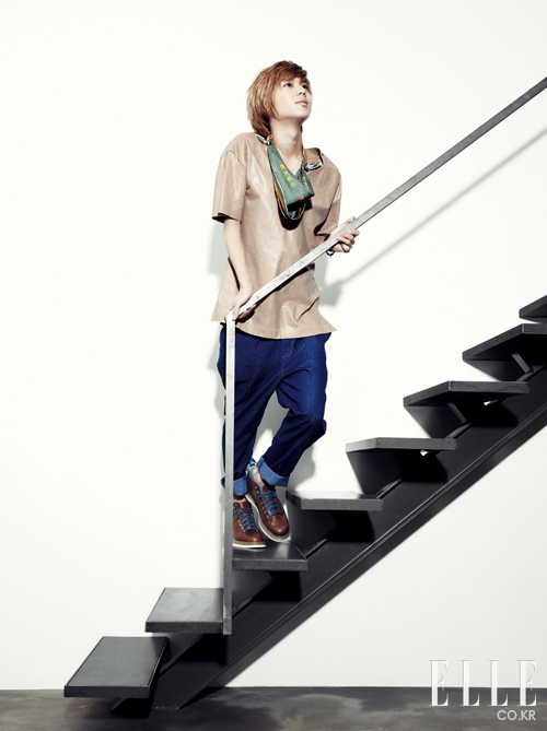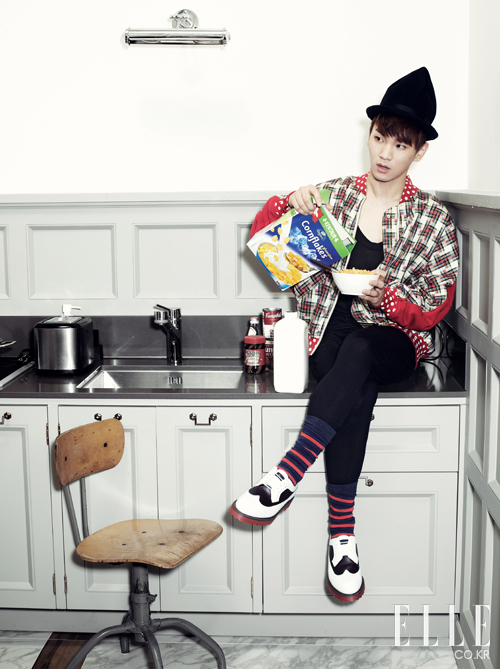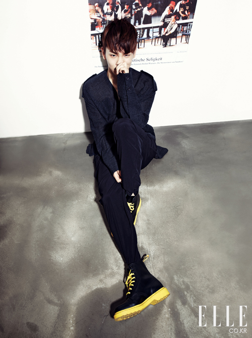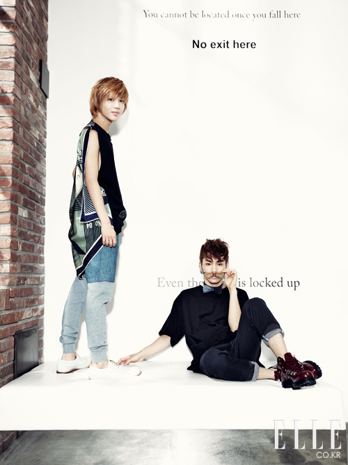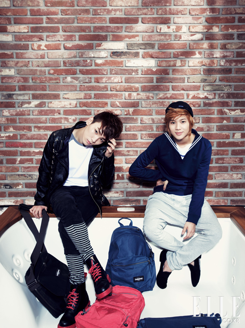 키가 입은 레더 재킷. 조이리치 by 보이플러스. 톱. 아디다스 오리지널스 by 오리지널스 데이비드 베컴. 팬츠. 프라보아 by 보이플러스. 슈즈. 닥터 마틴. 태민이 입은 세일러 스타일의 톱. 아페쎄. 이너와 모자. 모두 세인트 제임스 by 플랫폼. 팬츠. 아디다스 오리지널스. 슈즈. 레페토. 블랙 크로스백과 블루 패딩 백팩. 이스트백 Only d&shop. 재즈 핑크 백팩. 키플링 Only d&shop (www.dnshop.com).