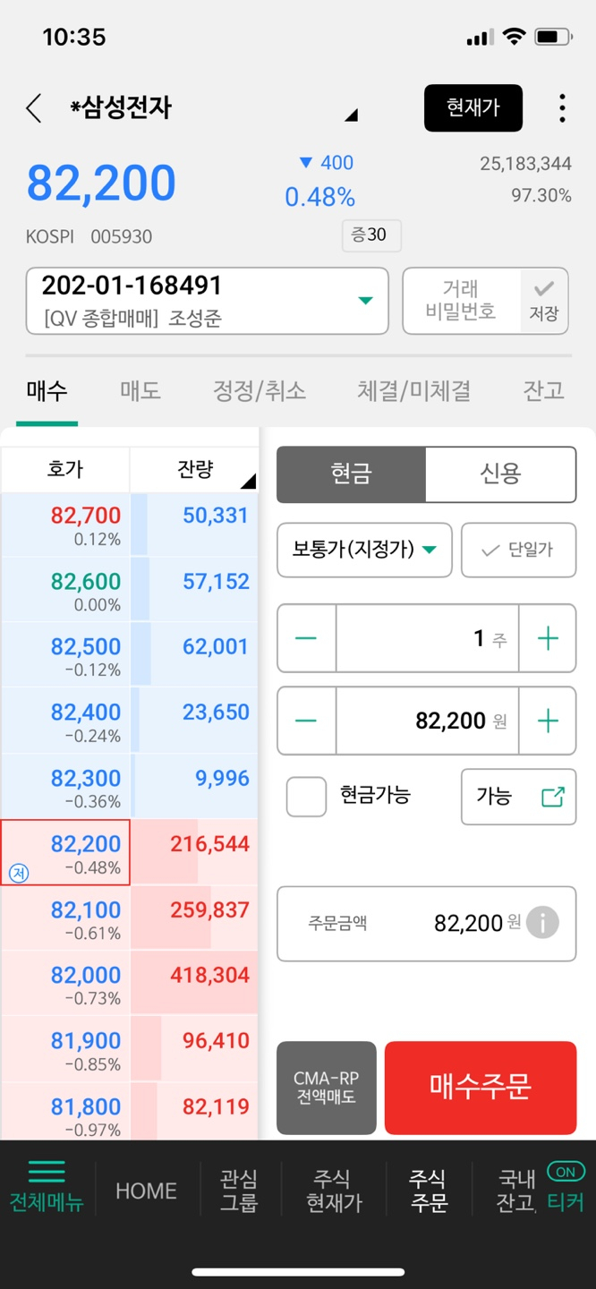 꼭 현재 가격에 주식을 매수하지 않아도 된다. 예컨대, 위 캡처 화면 상에서 삼성전자 주가는 82,200원이다. 하지만 더 싼 가격에 주식을 사고 싶다면 자신이 원하는 금액을 적어 넣고 ‘매수주문’ 버튼을 누르면 된다. 만약 82,000원에 주문을 걸면, 주가가 그 가격까지 떨어졌을 때 자동으로 매수가 이뤄진다. 주식을 팔 때도(매도) 마찬가지다. 굳이 현재 가격에 주식을 팔지 않아도 된다. 현재 주가보다 더 비싼 가격에 매도 주문을 넣어놓으면, 주가가 그 가격까지 올랐을 때 자동으로 팔린다.