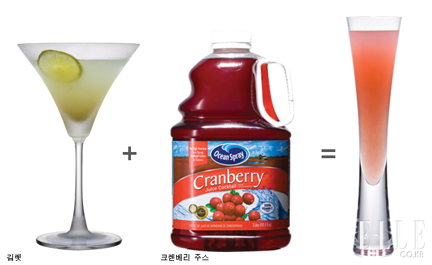 김렛 + 크랜베리 주스 크랜베리 주스는 칵테일의 조미료라고 할 만하다. 조금 밋밋한 칵테일에 크랜베리 주스를 넣으면 맛이 나아지는 경우가 많다. 크랜베리 주스 자체가 칵테일이다. 크랜베리 이외에도 많은 재료가 섞여 맛을 낸다. 시큼하고 남성적이지만 어딘지 단조로운 맛과 향을 가진 김렛에 크랜베리 주스를 넣으면 훨씬 마시기가 좋아진다. 드라이한 맛이 부담스럽다면 설탕 시럽을 넣으면 된다.