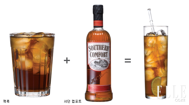잭콕 + 서던컴포트 가장 미국적이며 대중적인 칵테일 잭콕에 우리나라엔 유일하게 수입되는 미국산 리큐어 서던컴포트를 섞었다. 서던컴포트는 미국에선 ‘소코’라는 별칭으로 불리는 대중적인 리큐어. 콜라와 섞어 ‘소코앤콕’이라는 칵테일로도 흔히 마신다. 잭콕의 달큰하지만 다소 거친 맛이 서던컴포트의 복숭아 향과 섞여 훨씬 부드럽고 고급스러운 맛으로 변한다. 보다 여성적인 잭콕이랄까.