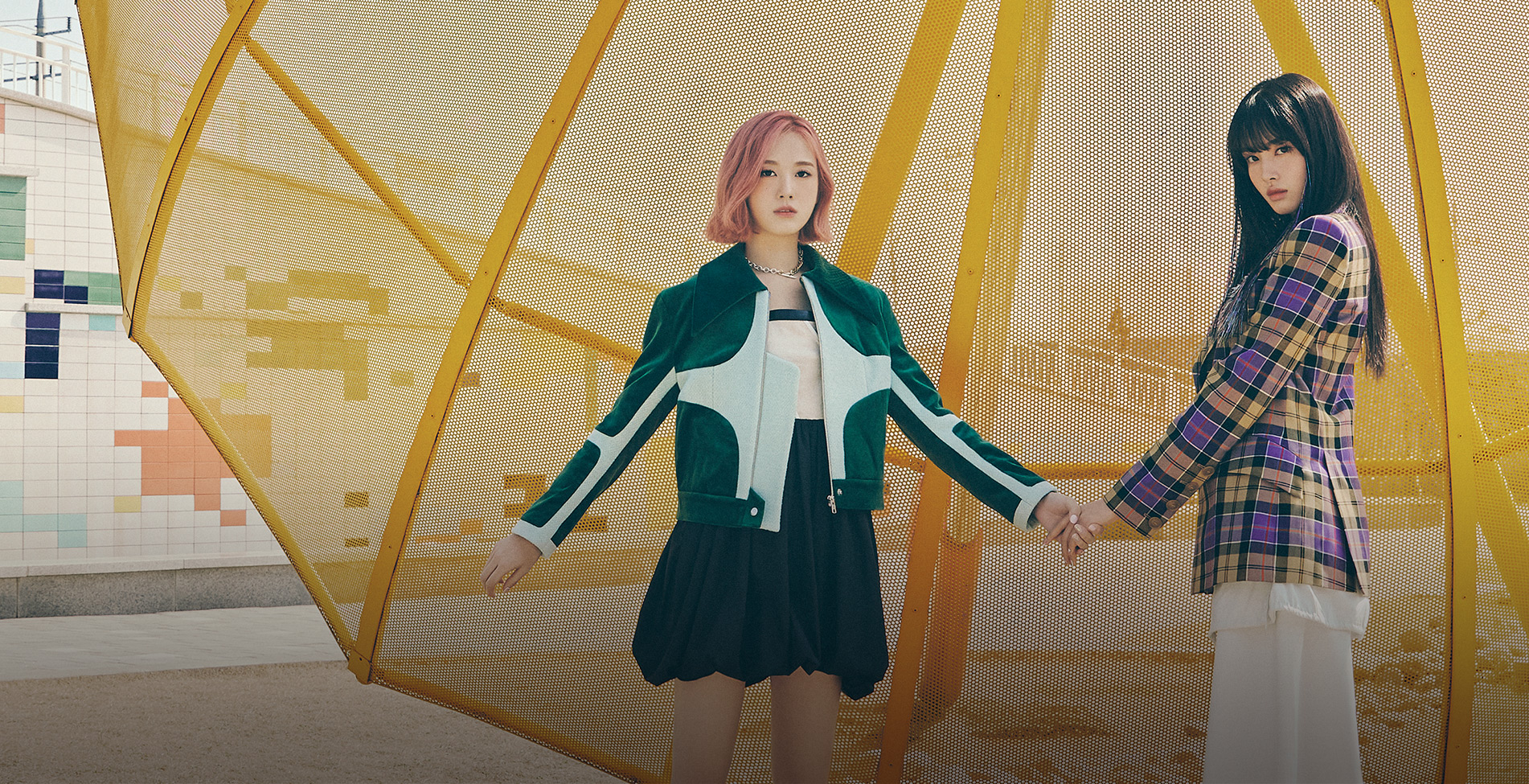재이가 입은 멀티 컬러 재킷은 Odlyworkshop. 볼륨감이 돋보이는 원피스는 Kijun. 레이스업 슈즈는 Rachel Cox. 체인 네크리스는 Leyie. 윤이 입은 체크 재킷은 Vivien Westwood. 화이트 스커트는 Odlyworkshop. 로퍼는 Rachel Cox.
