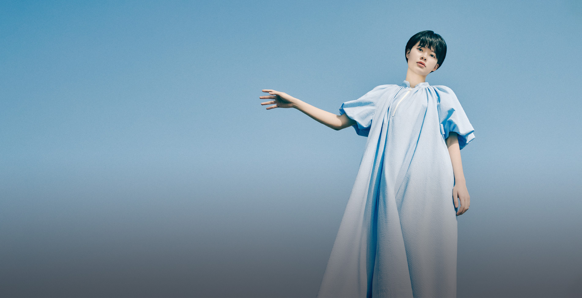 풍성한 실루엣이 돋보이는 파스텔 블루 드레스는 Minju Kim. 블랙 앵클부츠는 Ganni. 화이트 삭스는 스타일리스트 소장품.
