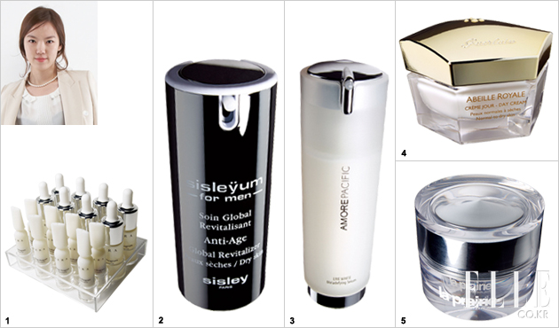 4 겔랑 아베이 로얄 링클 코렉션 퍼밍 데이 크림. 50ml, 18만1천원. 아카시아 꿀의 은은한 향취, 손끝에 닿는 풍성한 촉감, 바르는 즉시 매끈하게 정돈되는 피부 결, 어느 것 하나 빠지지 않는 크림. 얼굴 전체에 펴 바르고 마사지하다 보면 야근의 피로가 말끔히 사라진다. 리치한 크림은 좋아하지 않지만 노화가 걱정되거나 영양 공급이 필요한 사람이라면 만족도가 더욱 클 것이다.
