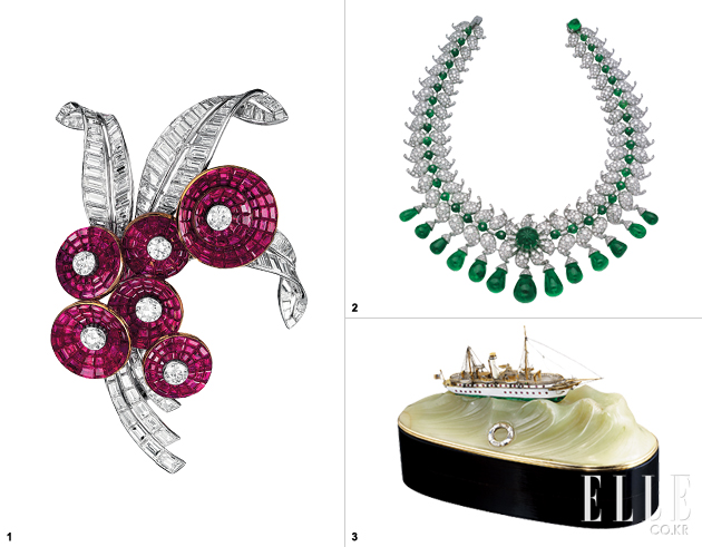 1 부케 브로치, 1937년 경 작. 2 바로다 왕조의 마하라니 왕비가 소장했던 인도 네크리스, 1950년 작. 3 바루나 쉽-폼 벨 푸쉬 1908년 작.