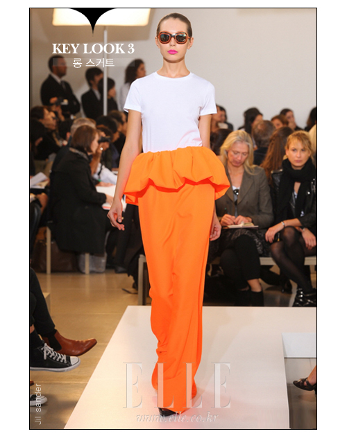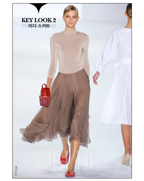 Designer 처방입니다! "풍성한 플레어 스커트는 하체의 볼륨이 커 전체적으로 스타일이 무거워 보일 수 있죠. 이럴 땐 반드시 무릎 밑의 선을 지켜 입는 것이 좋아요. 사실, 키가 작다면 끌로에 컬렉션의 플레어 스커트보단 H라인의 미디스커트를 권하고 싶네요. 하체의 보디라인을 살려주는 피트되는 H라인의 스커트라면 플랫 슈즈나 굽이 낮은 슬링백 슈즈를 신어도 다리가 짧아 보이지는 않으니 걱정마세요." |