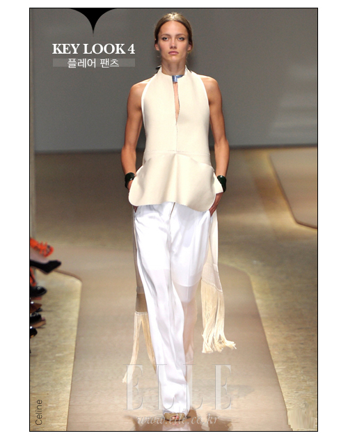 Designer 처방입니다! "플레어 팬츠를 키 큰 여자들의 전유물이라고 생각하는 건 고정관념이에요. 적당히 기장을 수선하면 오히려 키가 커 보이는 똑똑한 아이템이 될 수 있죠. 대신에 아주 미니멀한 스타일을 시도해보세요. 상하의의 컬러를 통일해 전체적으로 시선의 흐름을 분산시키지 말고, 팬츠를 강조하도록 가급적 짧은 상의를 입고 팬츠 속에 숨은 일등공신, 높은 펌프스를 신어보세요. 플레어 팬츠는 무릎부터 발목까지 라인이 넓에 떨어지기 때문에 앞 코가 슬림하게 떨어지는 스틸레토 힐이라던지 오픈 토 슈즈를 신어서 살짝 보이는 포인트 스타일링에 신경 쓰는 것도 좋겠죠." |