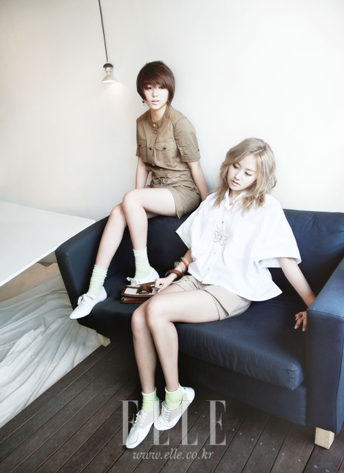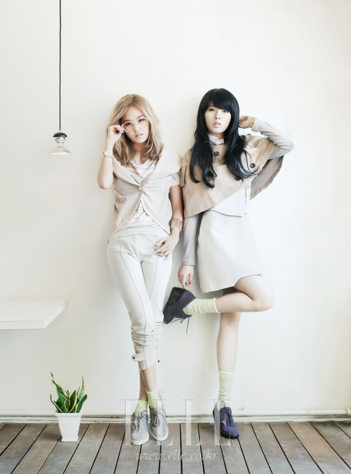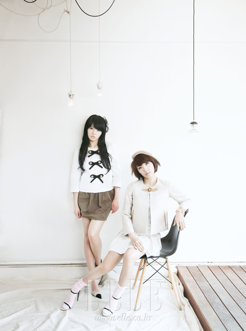 | 현아가 입은 리본 장식의 화이트 재킷. 베이지 스커트. 모두 모스키노 칩 앤 시크. 스트랩 펌프스. 보브. 헤어밴드. 꼴레트 말루프. 지윤이 입은 라이트 베이지 재킷. 화이트 플리츠스커트. 모두 산드로. 스트랩 샌들. 미우미우. 진주 장식된 베레모. 팔찌로 연출한 구슬 목걸이. 모두 제이미 앤 벨. 핑크 삭스. 스타일리스트 소장품. |