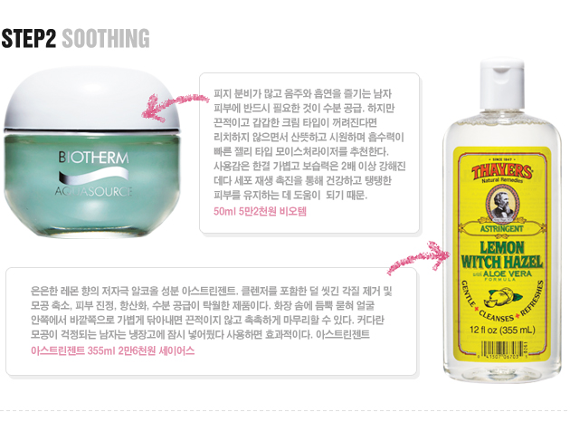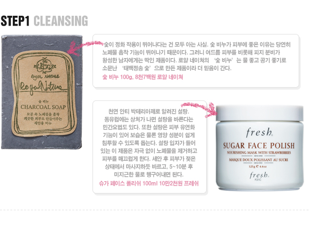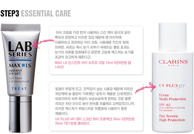 | 클렌징 단계에서는 세안과 스크럽에 신경써보자. 대부분의 남자들이 씻는 걸 은근히 귀찮아 한다는 거 안다. 아침에 일어나 세수할 때 비누를 안 쓴다는 얘기도 자주 들었다. 비누는커녕 고양이 세수도 다반사! 하지만 좋은 피부의 기초에 세안 습관이 있다는 건 백 번 강조해도 과하지 않은 대목이다. 일단 세안 시 비누는 필수다. 세안이라는 것이 피부 노폐물을 제거하는 건데, 비누 없이는 유분기가 제거될 리 없으니까. 그리고 일주일에 1~3회는 세안 후 스크럽제로 딥 클렌징을 해야 한다. 건성 피부는 1회, 지성 피부는 정도에 따라 2~3회가 적당하다. 또 한 가지 팁! BB 크림이나 자외선 차단제를 바른 날에는 반드시 클렌징 폼을 사용해야 잔여물이 말끔히 세정된다는 사실, 잊지 마시길. | |