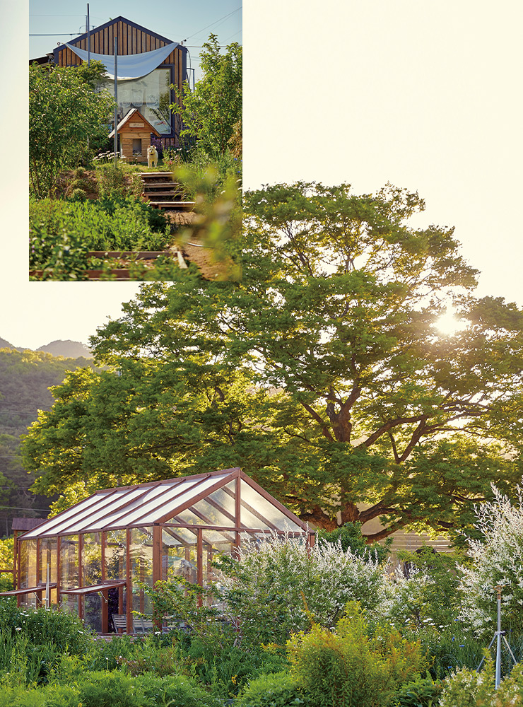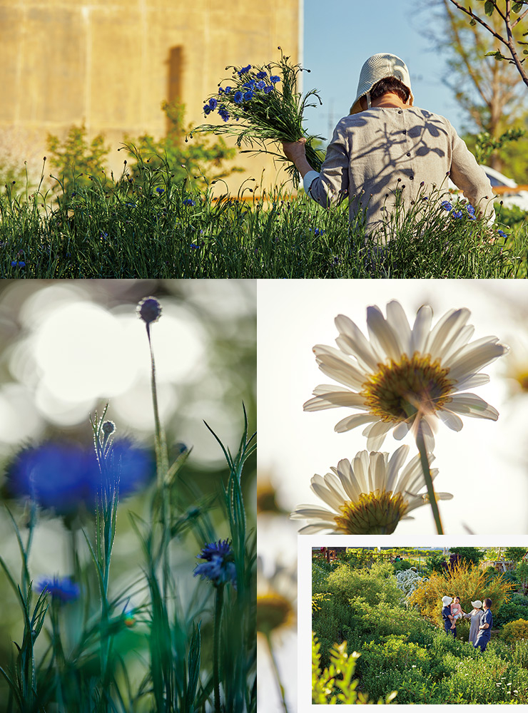 아산에서 30년째 꽃 가게 ‘평화꽃집’을 운영하는 어머니 이현숙은 이 꽃밭에서 성실하게 경작한 꽃을 가게에서 판다. 직접 기른 꽃을 파는 일은 그녀의 오랜 꿈이었다. 정년퇴임을 앞둔 남편이 이현숙의 꿈을 이루어주고자 팔을 걷어붙였고, 이구름을 비롯한 세 딸의 가족도 주말마다 힘을 합쳐 지난 4년간 성실하게 정원을 돌봤다. 열정과 호기심, 안달과 극성, 성찰과 관찰. 정원에 쏟아부은 모든 노력 덕에 이제는 계절마다 새로운 꽃을 보며 수확할 수 있게 됐다. “처음엔 정원 어귀에 있는 보호수밖에 없었어요. 밭에 엄청난 양의 흙을 가져와 붓는 일이 정원 가꾸기의 시작이었죠.” 지금은 푸른 수레국화와 캐모마일과 데이지의 계절. 수레국화는 해외여행에서 가져온 씨를 한 번 뿌린 이래 매년 밭을 가득 채울 만큼 피어난다. 이달이 지나고 나면 버바스쿰, 엉겅퀴, 베로니카와 레몬밤, 라벤더, 아마꽃 등이 고개를 들 것이다.