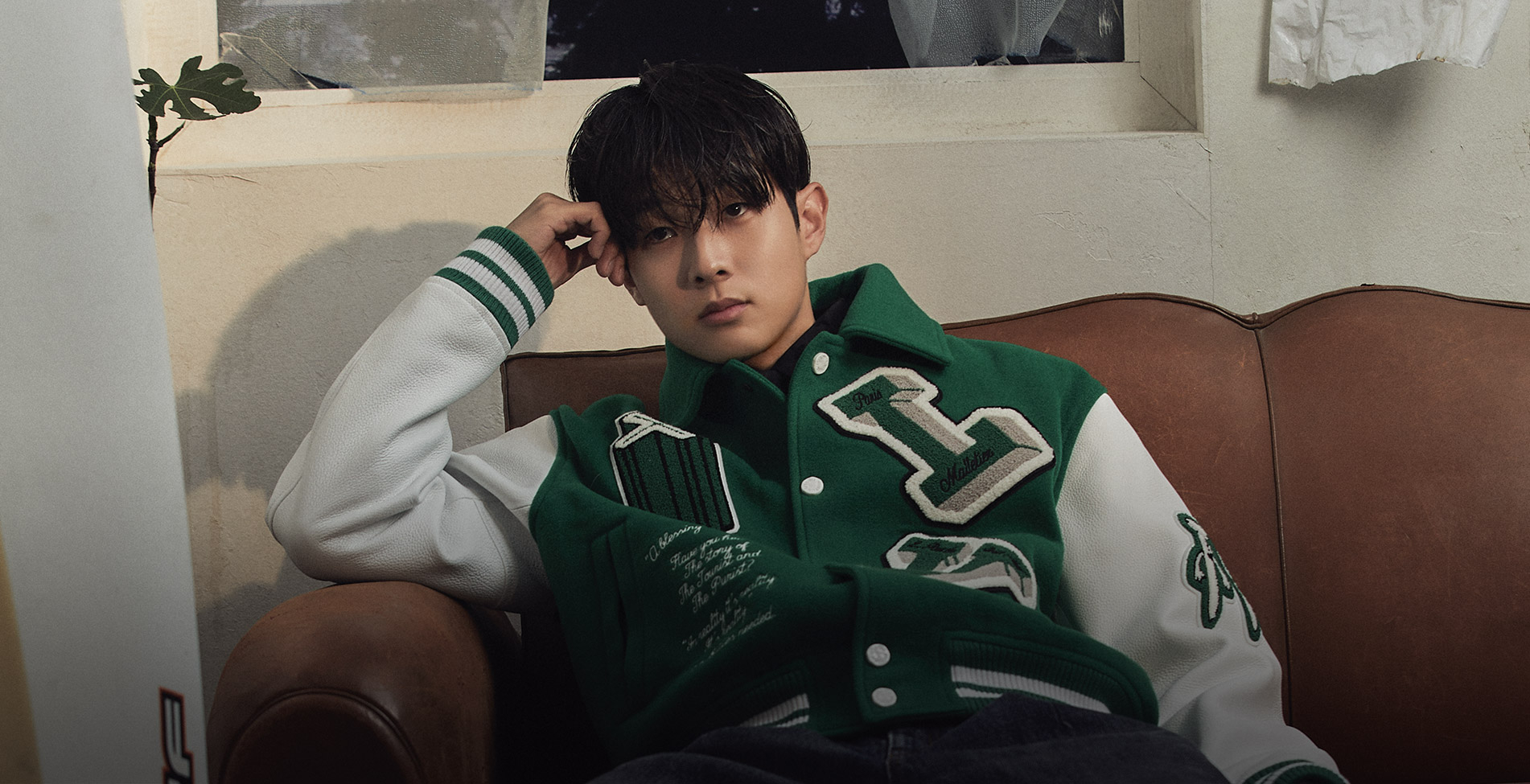 패치 장식의 스타디움 재킷과 와이드 데님 팬츠, 스니커즈는 모두 Louis Vuitton Men’s Collection.