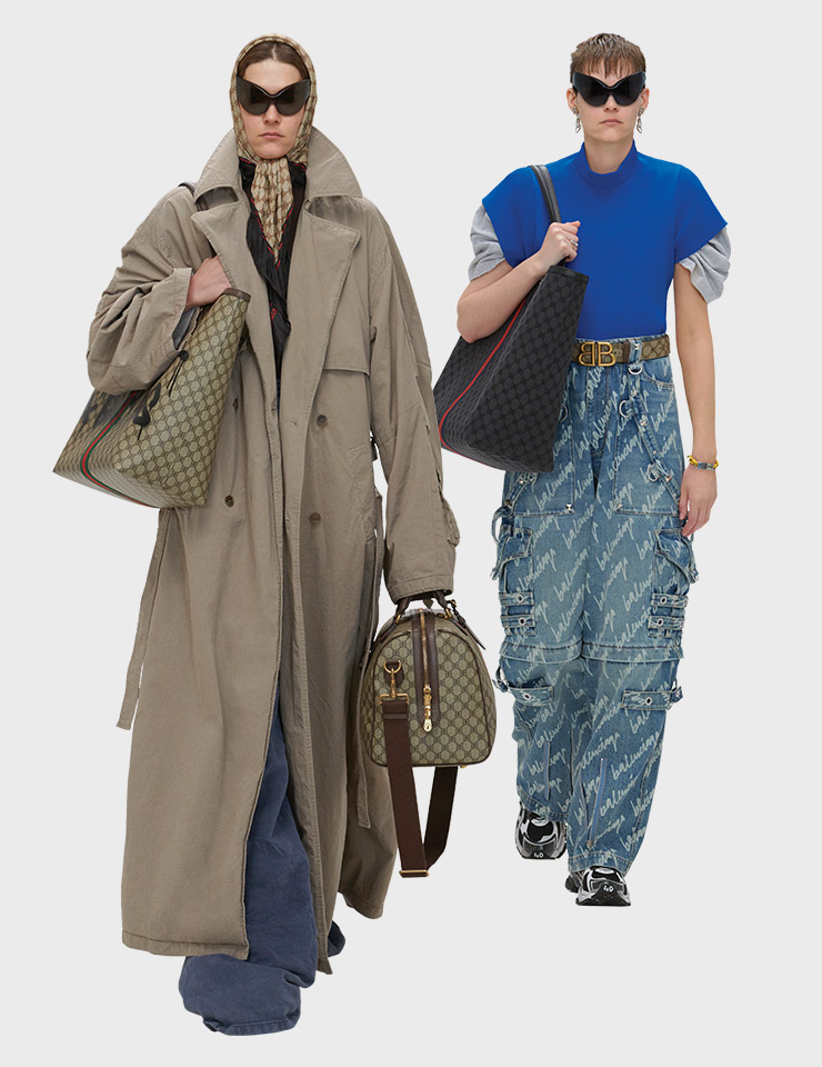 진실과 허구를 주제로 한 발렌시아가의 2022 S/S 컬렉션은 아티스트 엘리자 더글러스가 모든 룩을 소화하며 디지털 클론의 모습을 보여줬다. 그중 눈여겨볼 아이템은 구찌 아리아 컬렉션에서 먼저 공개된 해커 프로젝트다. 진정성과 모방, 도용에 대해 질문을 던지는 이 프로젝트는 구찌의 더블 G 로고가 더블 B 로고로 변형되거나 ‘THIS IS NOT A GUCCI BAG’ 같은 문구가 프린트된 아이템으로 구성됐다.