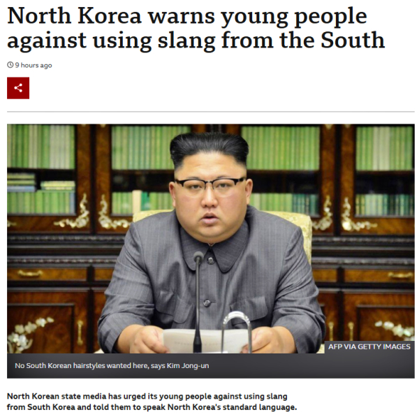 18일 BBC에 따르면 김정은은 “남한의 은어를 사용하지 말고, 북한의 표준어를 사용하라고 천명했다”고 보도했습니다. 그는 케이팝을 ‘악성 암’에 비유하며 “한류를 방치하면 북한이 젖은 벽처럼 무너질 수 있다”고 경고했습니다. 한편 김정은은 지난 4월 당 세포비서 대회에서 “청년세대의 사상 정신 상태에서 심각한 변화가 일어나고 있다. 옷차림과 언행까지 통제해야 한다”라며 ‘인간개조론’까지 거론했어요.