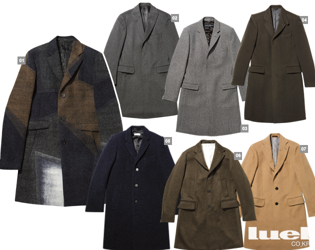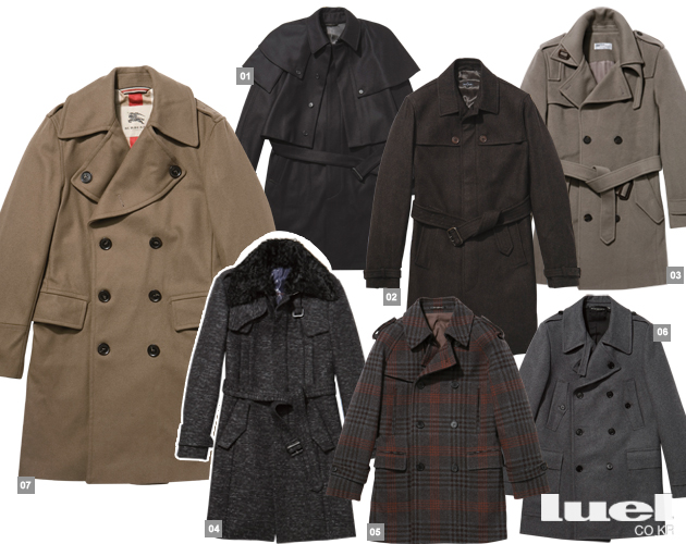 밀리터리 코트 밀리터리 코트란 말 그대로 군대의 유니폼 디테일을 활용한 코트를 지칭한다. 견장 장식, 높은 칼라, 허리 벨트 등이 밀리터리 풍 디자인의 가장 대표적인 디테일인데 이것을 가장 잘 반영한 건 뭐니뭐니해도 트렌치 코트다. 트렌치 코트는 방수 기능이 있는 개버딘 소재로 만드는 것이 정석. 하지만 버버리 프로섬과 준지 등을 비롯한 많은 패션 브랜드에서는 트렌치 코트를 응용한 겨울용 코트를 꾸준히 선보이고 있다. 코트 자체에 장식이 많은 편이므로 심플한 수트나 베이식한 울 팬츠 같은 단순한 옷과 매치하는 것이 현명하다. 또한 더블 브레스티드 코트처럼 왜소한 체격의 남자에겐 다소 부담스러운 아이템일 수 있다. 그럴 땐 길이가 무릎 위로 올라오는 밀리터리 코트를 선택한다.