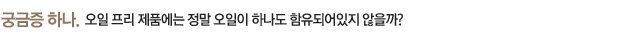| 화장품에서 오일 프리란, 오일이 한 방울도 들어 있지 않다는 뜻은 결코 아니다. 피부에 문제를 일으킬 만한 광물류 성분이 들어 있지 않거나 오일을 수분 캡슐로 감싸서 피부에 직접 닿았을 때의 감촉이 번들거리거나 오일 특유의 끈적이는 느낌이 나지 않도록 처리했다는 의미이다. |
