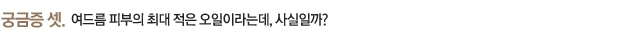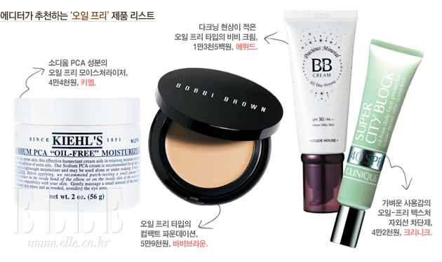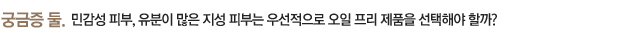 | 아무리 피부가 민감하고, 유분이 많은 지성피부라 할지라도 적당량의 유분은 꼭 필요하다. 사람의 피부는 꼭 수분만 필요한 것이 아니라 적당한 유분이 함께 어우러져야 건강한 피부를 유지할 수 있기 때문이다. 또 한 가지 중요한 사실 중 하나는 일반적으로 화장품을 제조할 때 지성피부에 좋은 유효성분이 오일 상태로 추출되는 경우도 있다. 이 경우에는 오일보다 큰 수분 입자가 오일을 감싸 캡슐처럼 감싸도록 제조된다. 따라서 무조건 오일 프리 제품만 고집할 것이 아니라 적당한 유,수분 밸런스를 맞춰줄 수 있는 제품을 여러 개 섞어 사용하는 것이 좋다. |