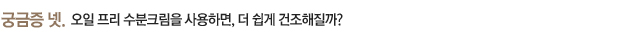 | 보통 지성피부에게 권하는 오일 프리 수분크림은 수분으로만 구성되어 있어 트러블을 유발하지 않으면서도 번들거리지 않아 무조건 좋다고 생각하는 경우가 많다. 하지만, 유분이 어느 정도 배제된 수분 크림만 고집하게 되면 피부를 보호해줄 막이 부족해지기 때문에 피부가 건조해져 각질을 일으키고 트러블을 유발할 수 있다. 따라서 무조건 오일 프리 제품만 선호하기 보다는 자신의 피부 문제를 제대로 파악한 후 제품 성분을 꼼꼼히 따져 구입 후 사용하는 것이 옳은 방법이다. |