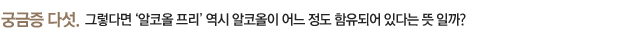 | 그렇지 않다. 오일 프리 제품에 오일이 아예 들어있지 않다는 거짓 정보 때문에 혼동하는 이들이 종종 있지만, 알코올 프리 제품은 정말로 알코올을 함유하고 있지 않기 때문에 민감한 피부의 경우 알코올 성분에 예민하므로, 제품을 구입할 때 ‘알코올 프리’ 표기를 꼭 확인하고 구입하는 것이 좋다. |