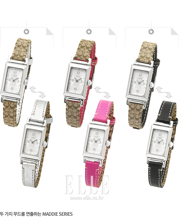 | 코치의 Maddie(매디) 시리즈는 도구를 사용하지 않고 간단히 밴드를 돌려 두가지 형태의 밴드로 사용할 수 있는 합리적인 리버서블 아이템이다. 한쪽은 코치의 시그니처 로고가 새겨진 밴드이며 다른 한쪽은 블랙, 핫핑크, 실버 계통의 컬러 밴드로 이루어져 있다. Maddie(매디) 시리즈는 T.P.O에 맞게 연출할 수 있는 장점을 가졌으며, 슬림한 밴드와 심플하고 모던한 다이얼이 특징이다. 매디 시리즈의 3가지 워치는 모두 43만 5천원. |
