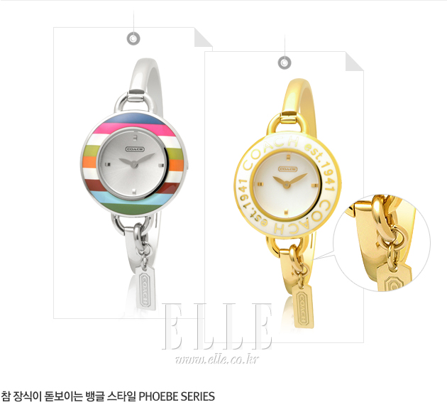 | 꾸준히 사랑을 받고 있는 코치 워치의 Phoebe(피비) 시리즈 중 레가시 스트라이프 패턴이 돋보이는 워치는 뱅글 다이얼에 코치만의 아이덴티티를 잘 살린 제품이다. 톡톡 튀는 비비드한 컬러가 생기발랄한 분위기와 경쾌함을 더한다. 또한, 케이스를 따라 새겨진 로고 장식이 특징인 워치는 골드 컬러와 화이트 컬러가 조화를 이루며 깔끔하면서도 세련된 느낌을 준다. 비비드한 컬러의 워치는 49만 5천원, 골드 컬러의 워치는 53만 5천원. | |