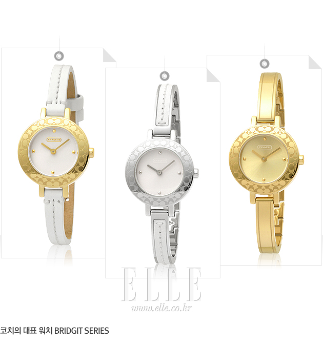 | 코치워치의 대표적인 디자인인 Bridgit(브리짓) 시리즈. 얇은 밴드와 베젤에 새겨진 C자로고가 특징이며, 손목에 감기는 착용감이 편안하다. 얇은 팔찌와 함께 레이어드하면 모던하면서도 세련된 분위기를 연출 할 수 있다. 또한 정장이나 캐주얼 등 어떤 차림에 매치하여도 잘 어울리는 실용적이며 활용도 높은 아이템이다. 골드 프레임에 화이트 밴드워치는 43만 5천원, 실버 프레임 워치는 49만 5천원, 골드 프레임에 골드 밴드 워치는 53만 5천원. | |