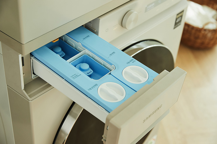 BESPOKE 그랑데 세탁기 AI는 세탁물 무게에 맞춰 자동으로 정량의 세제와 유연제를 투입한다. 한 번 넣어 놓으면 한 달간 보충 없이 사용 가능해 매번 세제와 유연제를 넣지 않아도 되므로 편리하다.
