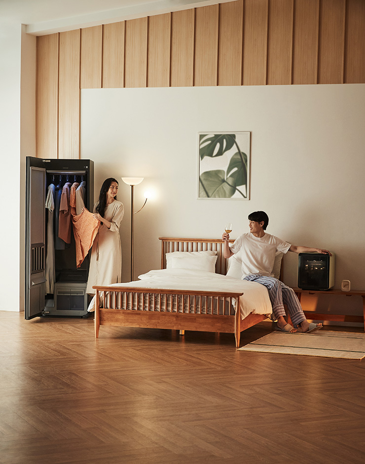 아늑한 침실에서 주말을 마무리하며 다가오는 한 주를 준비하는 저녁. BESPOKE 에어드레서와 BESPOKE 큐브 냉장고는 부부만의 편안한 주말 저녁을 책임진다. 진동, 소음이 적어 침실에 두기 적합하고 조용하고 편안한 휴식을 선사한다.