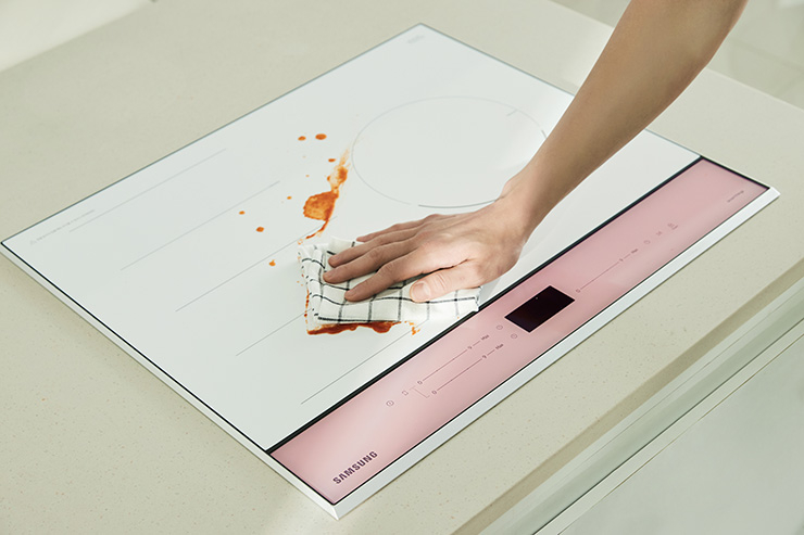 견고한 화이트 쇼트세란 글라스 소재로 상판에 음식물이 흘러 넘쳐도 쉽게 닦이고 오래도록 사용해도 변색 걱정이 없다. 화사한 화이트 글라스가 주방 공간을 돋보이게 하며, 5가지 다양한 조작부 컬러가 감각적인 키친테리어를 완성해준다.