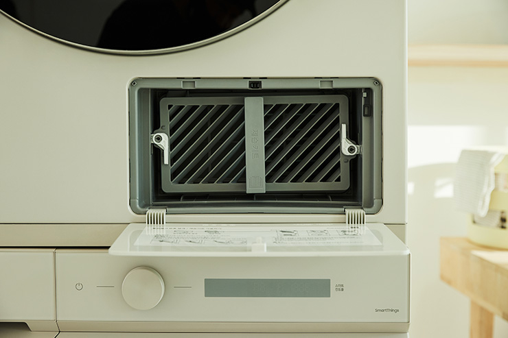 BESPOKE 그랑데 건조기 AI 의 제습 키트™는 환기가 어려워 습하고 꿉꿉해지기 쉬운 세탁실이나 다용도실을 보송하고 쾌적한 공간으로 간편하게 관리할 수 있다.