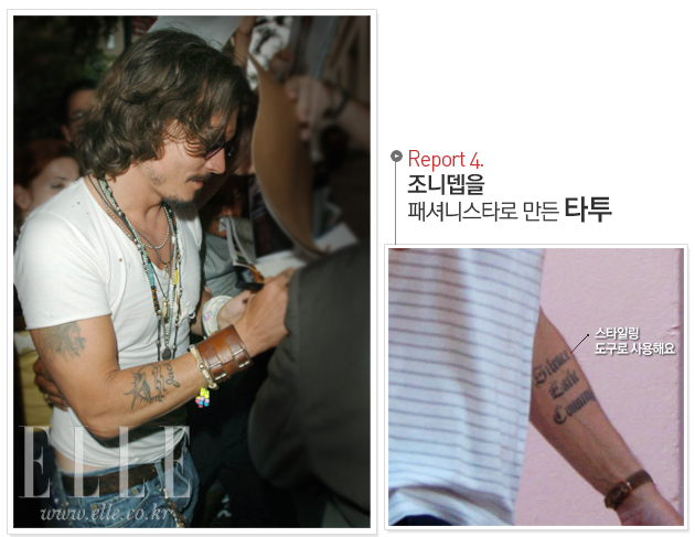 쉽게 소화할 수 없는 괴짜 연기를 식은 죽 먹기처럼 해내며, 어떤 패션도 자기 스타일대로 소화해내는 패셔니스타 조니뎁. 의미를 되새기기 위해 새긴 타투가 그에게는 너무도 잘 어울려 스타일을 업시키는 도구로 활용된 듯 보인다. 그의 왼팔 안쪽에 새긴 문자 타투는 '제임스 조이스(James joyce)'의 소설인 '젊은 예술가의 초상'에 나오는 ‘Silence exile cunning'이라는 구절인데, 그 뜻은 ‘침묵은 교활함을 추방한다’는 뜻이다. 그리고 그의 오른팔 아래에 새겨진 새와 'Jack'은 많은 사람들이 영화<캐리비안의 해적>의 ‘잭 스페로우’선장을 뜻하는 문신이라고 추측했는데, 이것은 그가 사랑하는 아들인 ‘잭 댑’을 상징한다. |