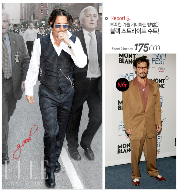 Good 패션 감각이면 패션 감각, 연기면 연기 어느 하나 모자란 것 없는 조니뎁에게 조금 부족한 것이 있었으니, 그것은 바로 키. 물론 175cm가 작은 키는 아니지만 180cm 이상의 장신 배우들이 넘치는 할리우드에서는 조금 부족해 보인다. 그런데 그 부족함을 채워줄 방법은 블랙 스트라이프 수트에 있었다. 시크한 블랙 컬러에 세로 스트라이프까지 더해지니 바로 게임 끝!