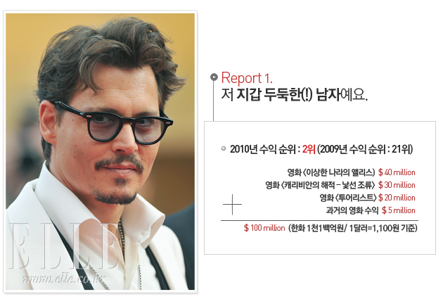 연예전문지 ‘베니티 페어’가 2010년 한 해 수익을 놓고 “할리우드 최고 소득 TOP 40”을 발표했는데, 조니뎁이 1억달러 (한화 1천1백억원/ 1달러=1,100원 기준)의 소득을 기록하면서 2009년 21위에서 2010년 2위를 차지하며 19위 상승했다. 그는 영화<이상한 나라의 앨리스>로 4천만 달러(한화 약 4백 4십억원 / 1달러=1,100원 기준)를 벌어들이면서 남녀배우를 통틀어 최고의 소득을 기록했다. 전체 1위는2억 5천 7백달러(한화 2천 8백억원 / 1달러=1,100원 기준) 의 소득을 올린 영화<아바타>의 제임스 카메론 감독이 차지했다. |