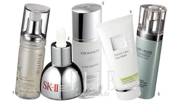 1 플로리아 화이트닝 캡슐 에센스. 50ml. 1만8천원, 토니모리 2 화이트닝 스팟 스페셜리스트. 30ml. 14만원대, SK-II 3 화이트 리빌 에센스. 50ml. 15만5천원, 크리스챤 디올 4 필&케어 고지 마스크. 50ml. 3만3천원, 아르데코 5 사이버화이트 브릴리언트 셀 풀 스펙트럼 브라이트닝 밀키 로션. 100ml. 10만원대, 에스티 로더