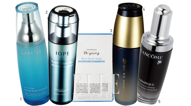 1 사계절 내내 사용하기 좋은 워터뱅크 에센스. 60ml. 3만5천원대, 라네즈 2 플랜트 스템셀 스킨 리뉴얼 세럼. 50ml. 8만원, 아이오페 3 로즈 페이셜 마스크. 18ml×5. 1만5천원, 닥터영 4 채음 에센스. 50ml. 6만5천원, 한율 5 제니피끄 유스 액티베이터 50ml. 16만5천원, 랑콤 |