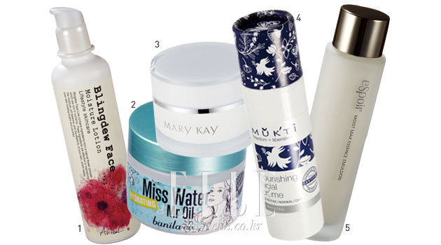 1 블링듀 페이스 모이스처 로션. 150ml. 1만9천원, 아리얼 2 미스 워터&미스터 오일 하이드레이팅 크림. 50ml. 3만원, 바닐라 코 3 멜라셉 나이트 크림. 30ml. 8만2천원, 메리케이 4 나리싱 페이셜 크림. 50ml. 6만8천원, 묵티 5 모이스트 맥스 에센스 에멀젼. 150ml. 2만8천원, 에스쁘아 |