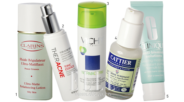 1 울트라 매트 리밸런싱 로션. 30ml. 4만5천원, 클라란스 2 테라크네 토닉 에센스. 50ml. 3만5천원대, 태평양제약 3 놀마덤 트리 악티브 안티임퍼펙션 하이드레이팅 크림. 50ml. 3만7천원대, 비쉬 4 퓨리파잉 젤. 50ml. 2만3천원, 까띠에 by 온뜨레 5 안티 블레미쉬 솔루션즈 클리어링 모이스처라이저. 50ml. 3만4천원, 크리니크 |