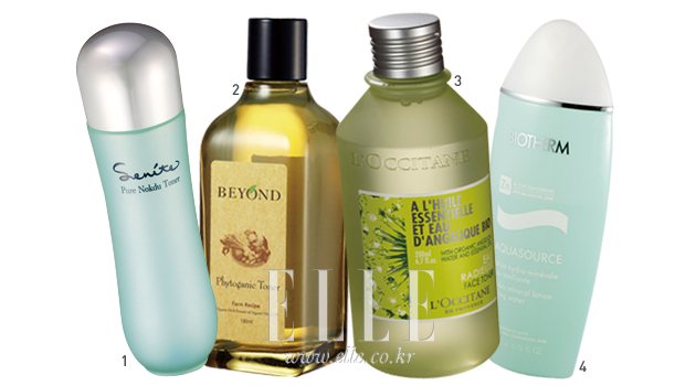 1 피부에 촉촉함을 선사하는 퓨어녹두 토너. 150ml. 2만5천원, 세니떼 2 피토가닉 토너. 180ml. 3만7천원, 비욘드 3 엔젤리카 페이스 토너. 200ml. 3만2천원, 록시땅 4 아쿠아수르스 스킨로션. 200ml. 3만2천원, 비오템 |