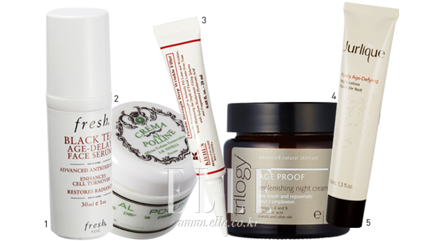 1 블랙 티 안티에이징 퍼밍 세럼. 30ml. 14만5천원, 프레쉬 2 크레마 알 폴리네. 50ml. 16만8천원, 산타마리아 노벨라 3 더블 스트렝스 딥 링클 필러. 20ml. 7만5천원대, 키엘 4 리플랜싱 나이트 크림. 60g. 7만6천원, 트릴로지 5 퓨얼리 에이지 디파잉 나이트 로션. 40ml. 8만6천원, 쥴리크 |